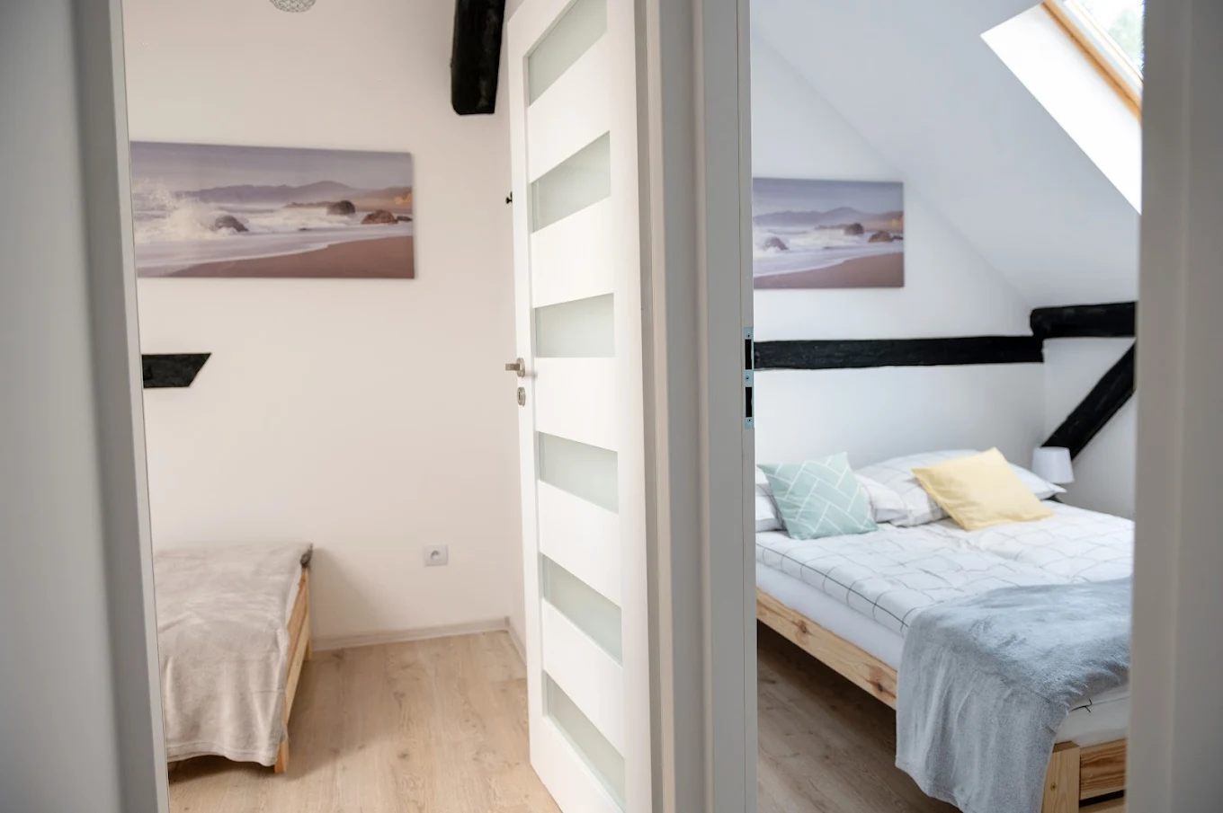 dwiema niezależnymi sypialniami, oraz z możliwością spania także w pokoju głównym (rozkładana sofa,